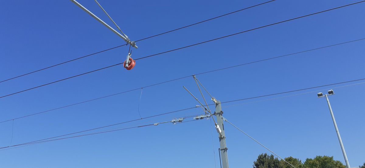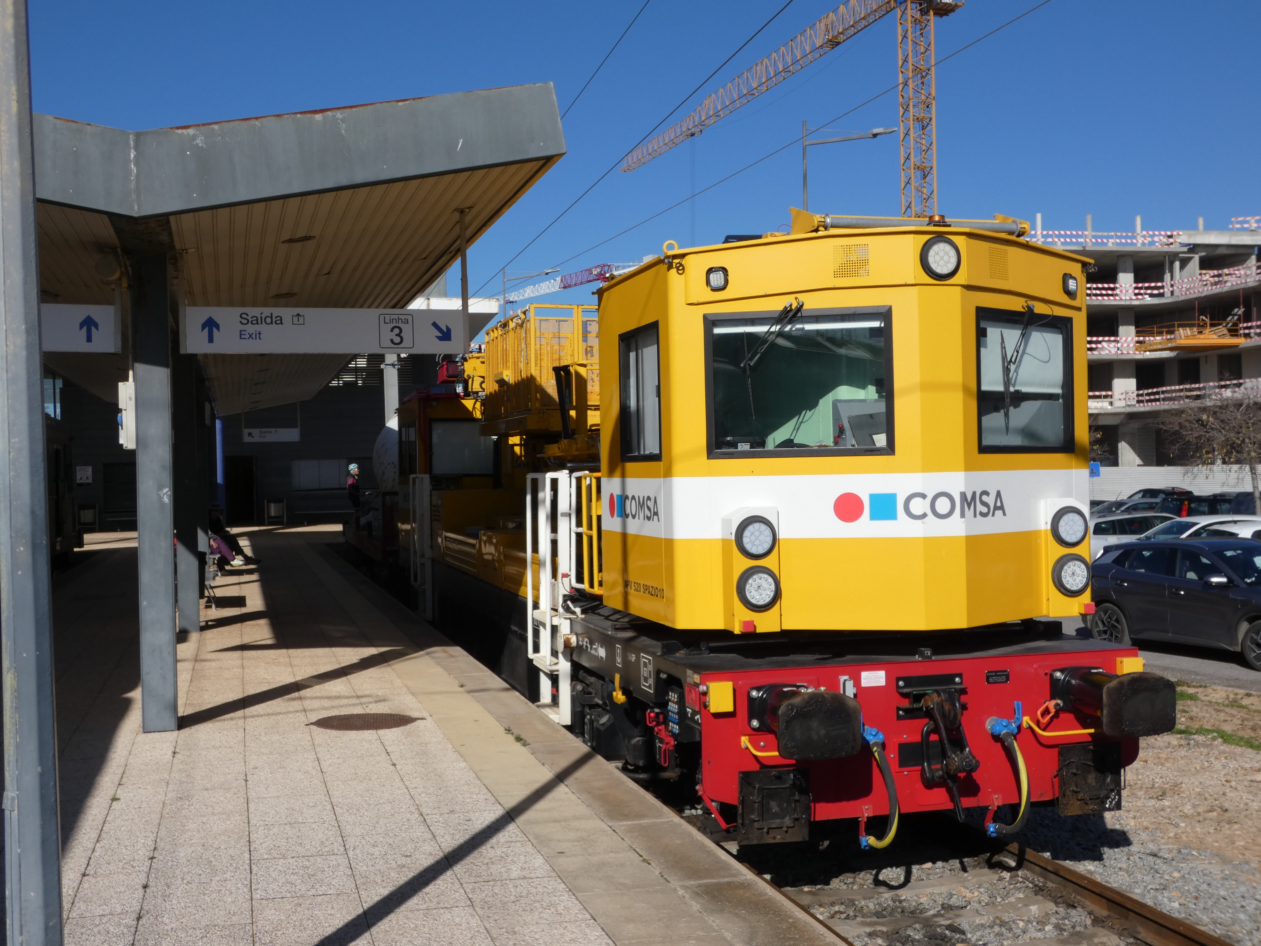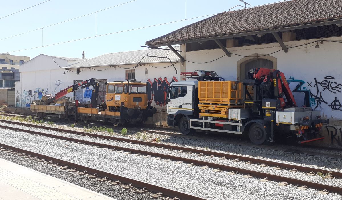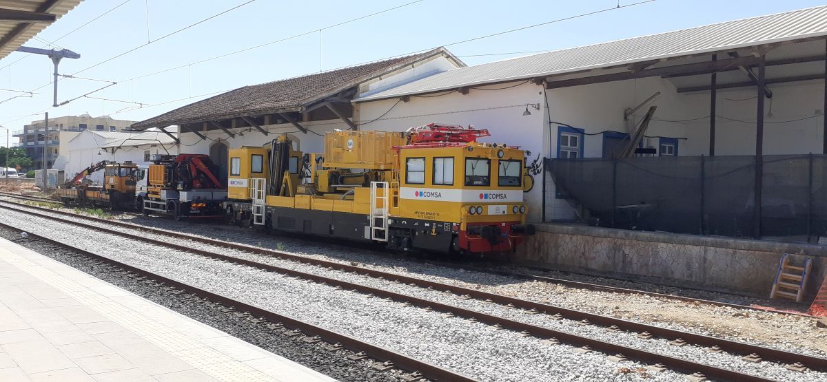 | A visit on 19th December 2023 showed that wiring was complete only about a third of the way along the 56km of track. Various pieces of equipment were sitting in sidings. They only come out at night! Click to see a larger size. The first three were at Faro, the other one in the shadows at Tavira. | ||