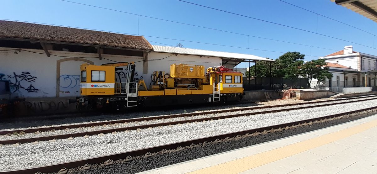 A visit on 19th December 2023 showed that wiring was complete only about a third of the way along the 56km of track. Various pieces of equipment were sitting in sidings. They only come out at night! Click to see a larger size. The first three were at Faro, the other one in the shadows at Tavira. | ||